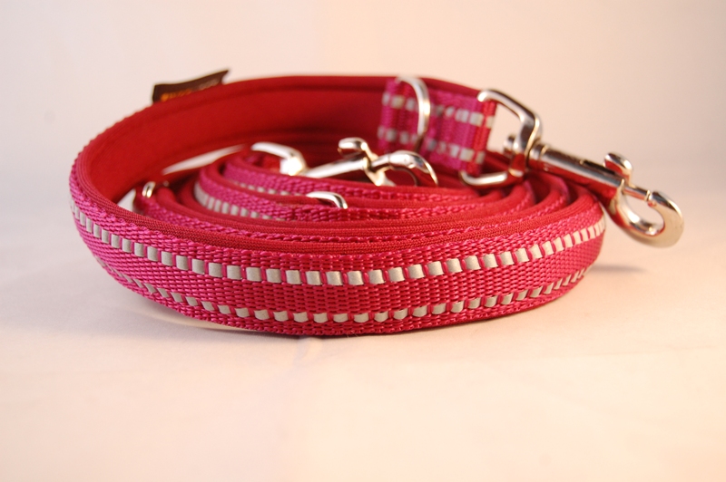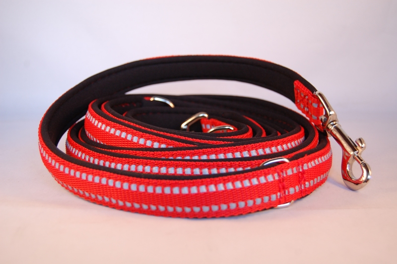Gepolstert wird die Hundeleine reflektierend mit Neopren (wasserabweisend, weich, fusselt nicht) oder Polarfleece (kuschlig, weich).